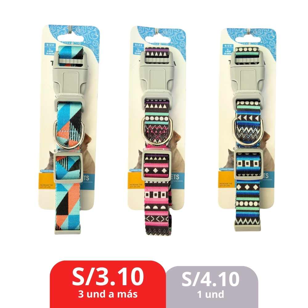 Collar para mascota de 2.5 cm de ancho, ajustable entre 36-59 cm, disponible en colores surtidos según el diseño, con 3 modelos diferentes y ganchos de metal para mayor seguridad.