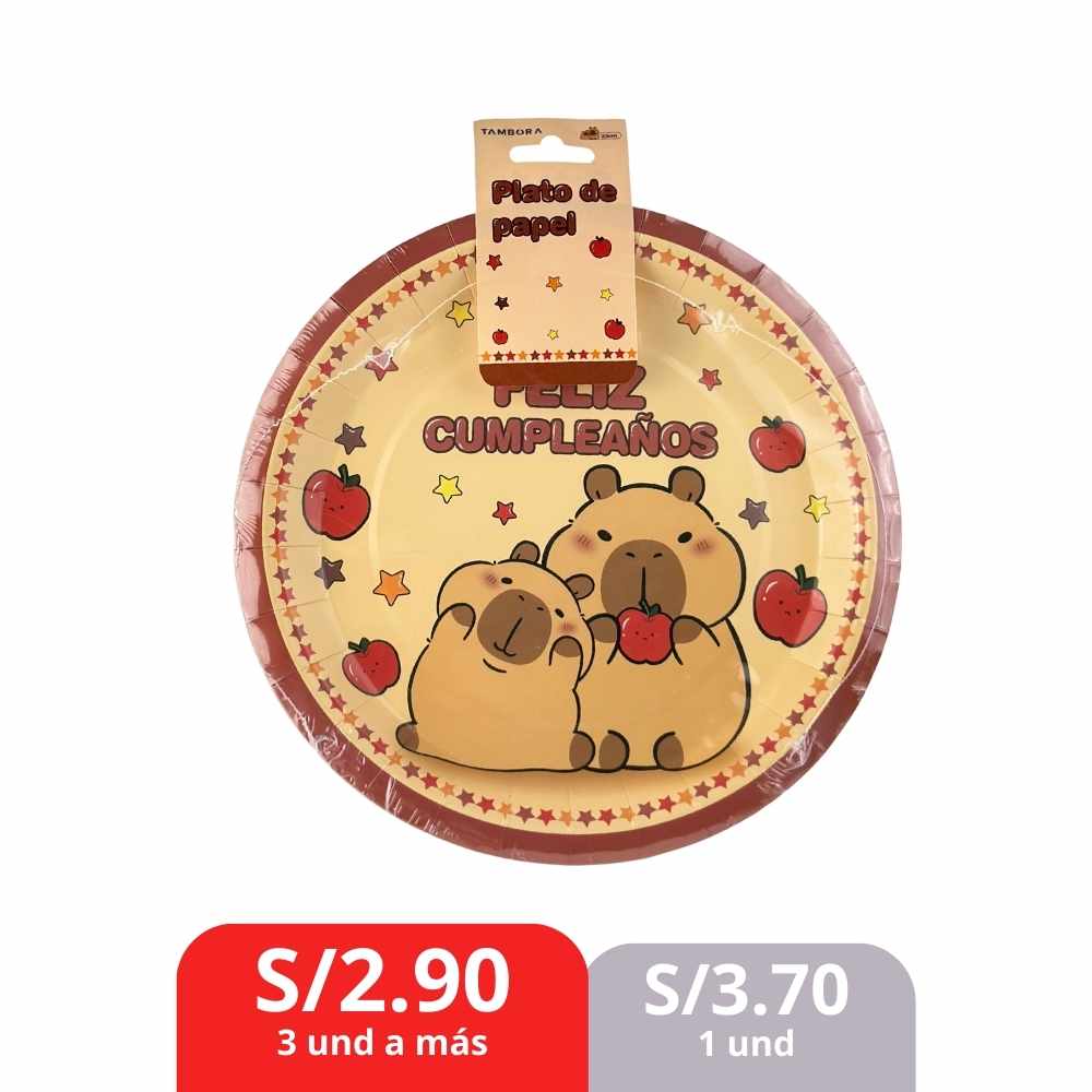 Plato de papel de 23 cm con un encantador diseño de capibara, ideal para servir aperitivos, postres o platos principales en fiestas de cumpleaños o eventos temáticos.
